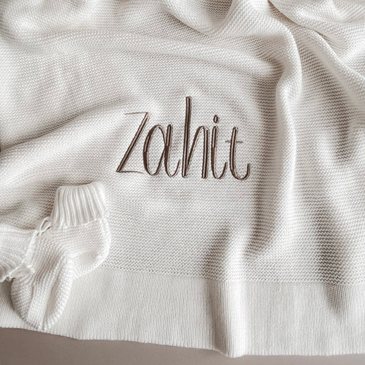 Auf Wunsch besticken wir deine Decke mit dem Namen deines Babys – für ein ganz persönliches Erinnerungsstück, das lange Freude macht.