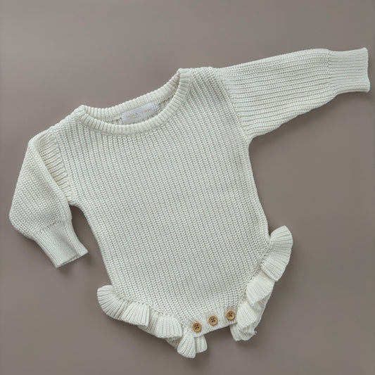 Strick-Overall | Weiß + Strickmütze & Strickschühchen Mokka