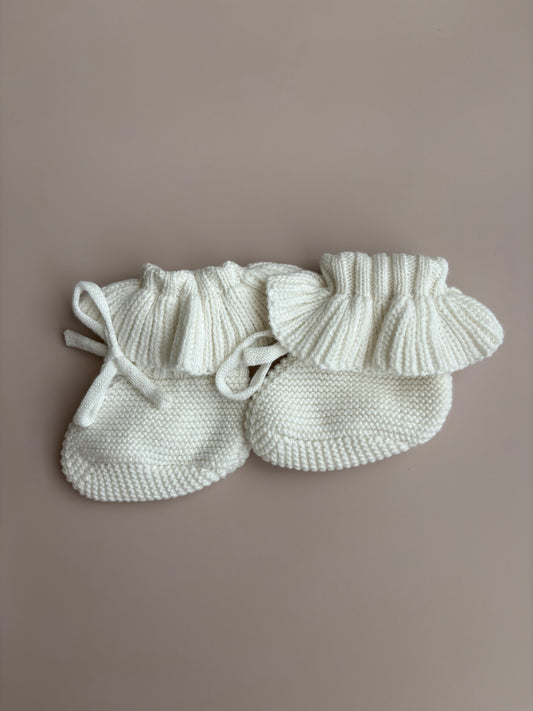 Strick-Strampler „He‘s here“ in Teddybraun | + Strickmütze und Strickschühchen in Weiß
