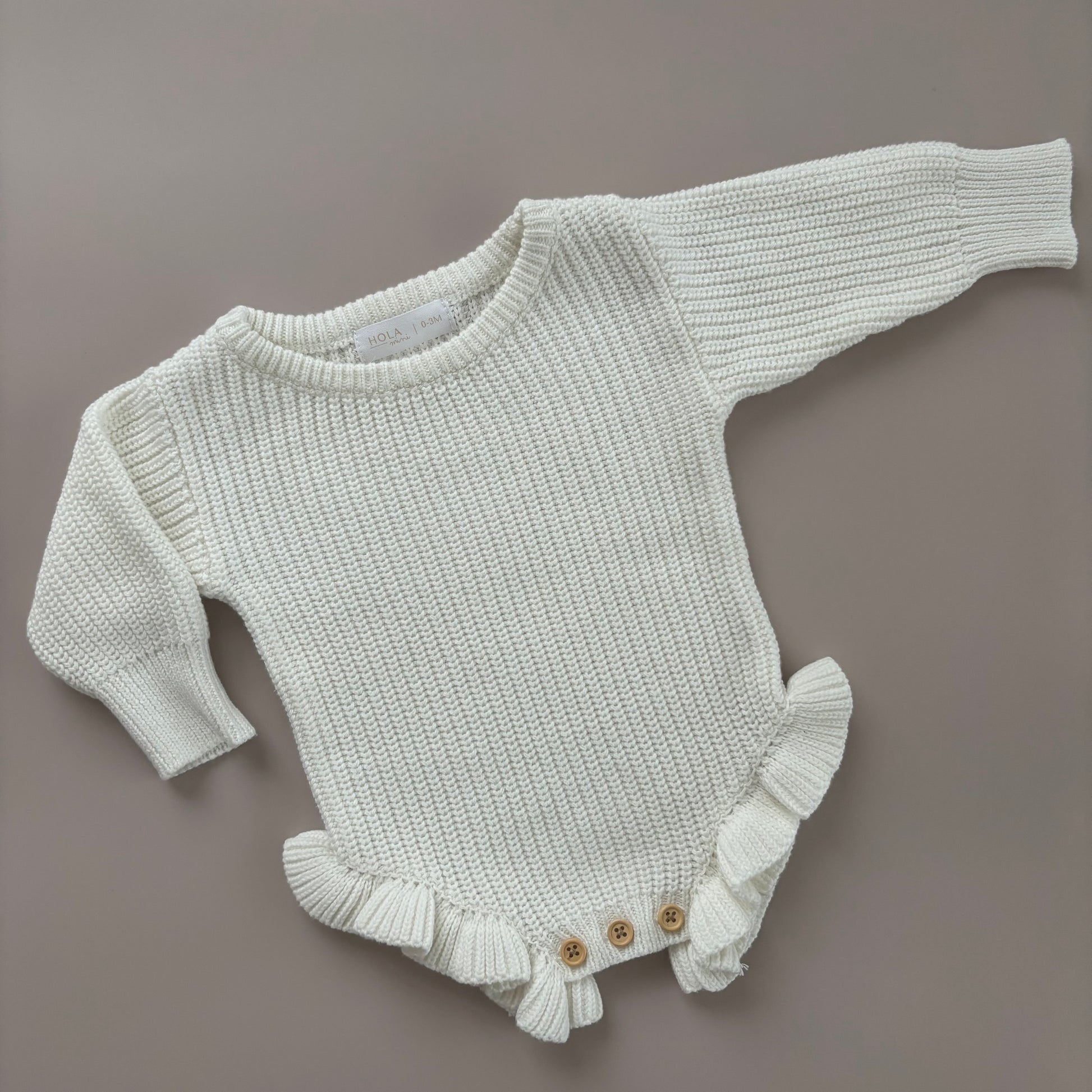 Die verspielten Rüschen-Details verleihen dem Strampler eine romantische Note, während die praktischen Knöpfe im Windelbereich das An- und Ausziehen sowie das Wickeln besonders einfach machen.