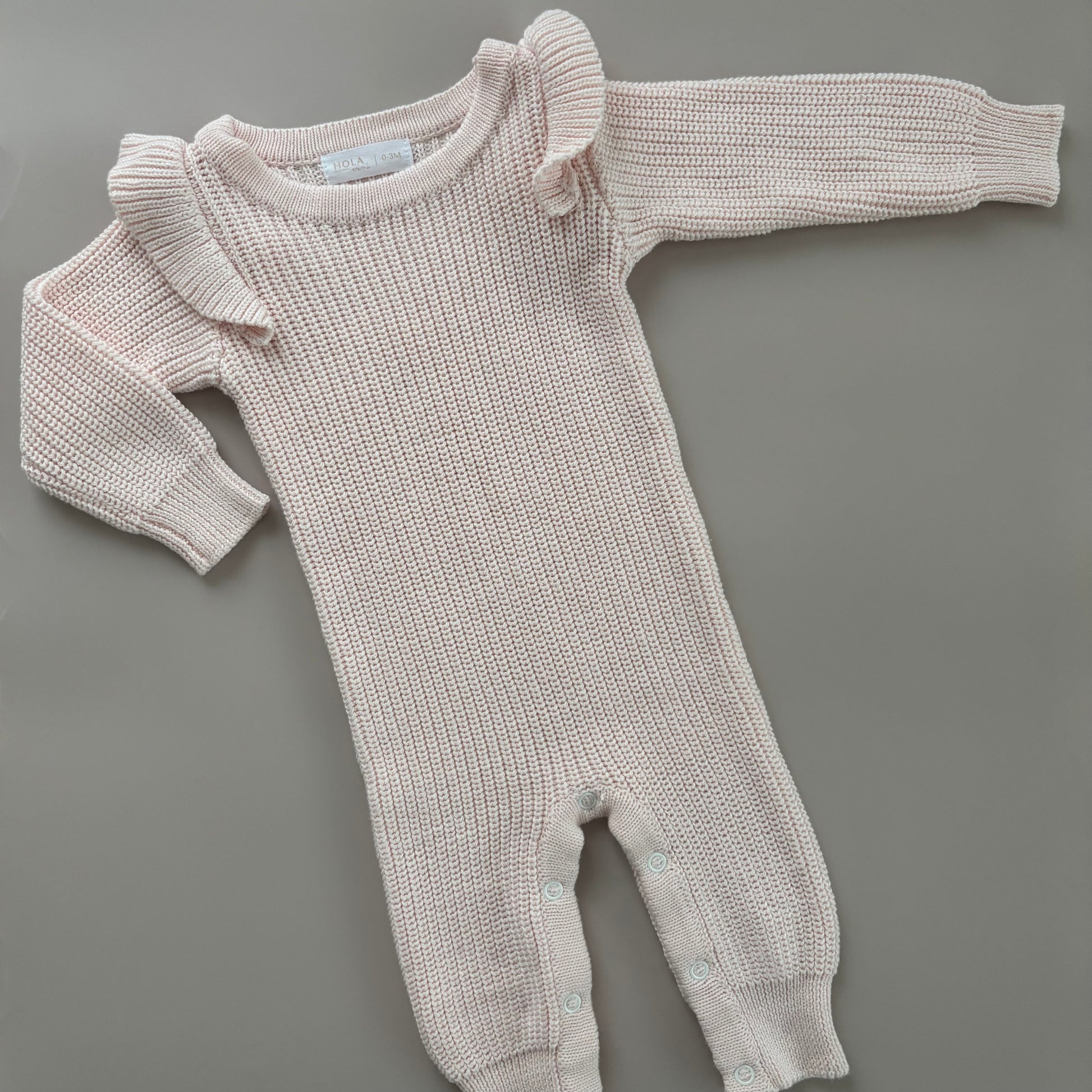 Dieser zarte Strick-Overall in Hellrosa vereint Komfort und verspieltes Design. Die Rüschen an den Schultern verleihen ihm eine süße, elegante Note und machen ihn zu einem echten Hingucker – ideal für besondere Anlässe oder den Alltag.